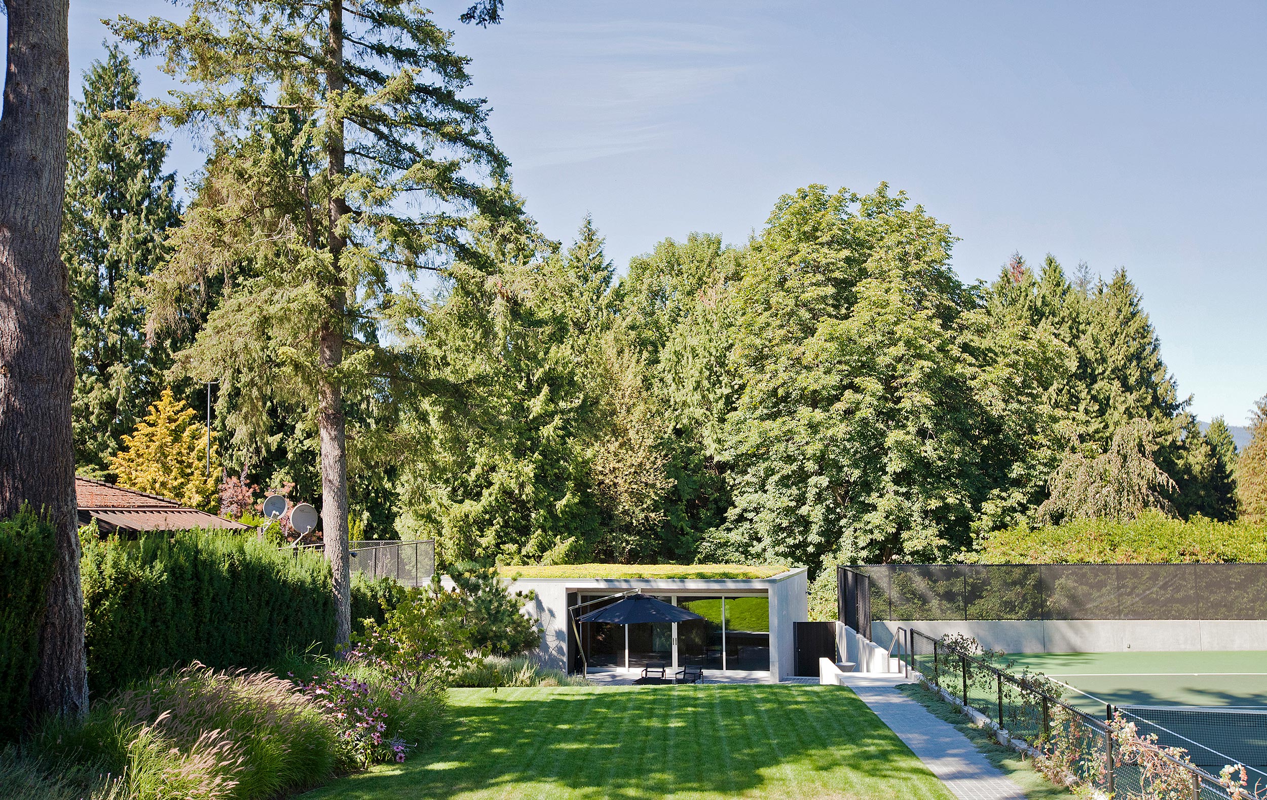 Modern home landscape with gardens, flowers, cobble driveway and patio.