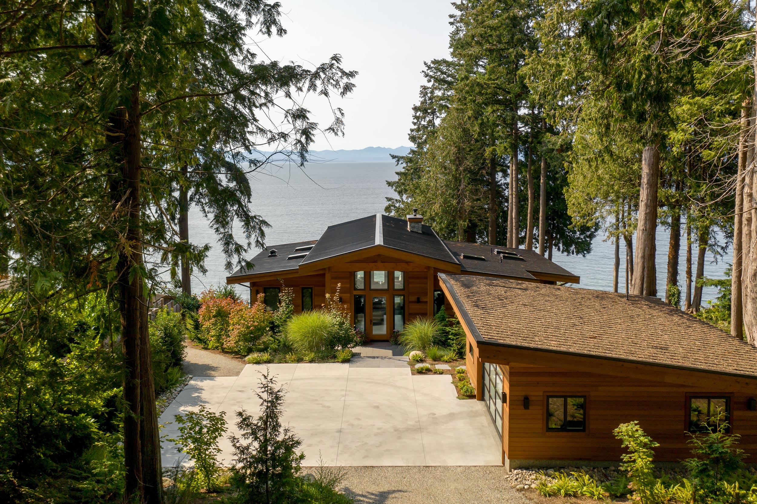 West Coast waterfront home with concrete driveway, front-entrance landscaping.